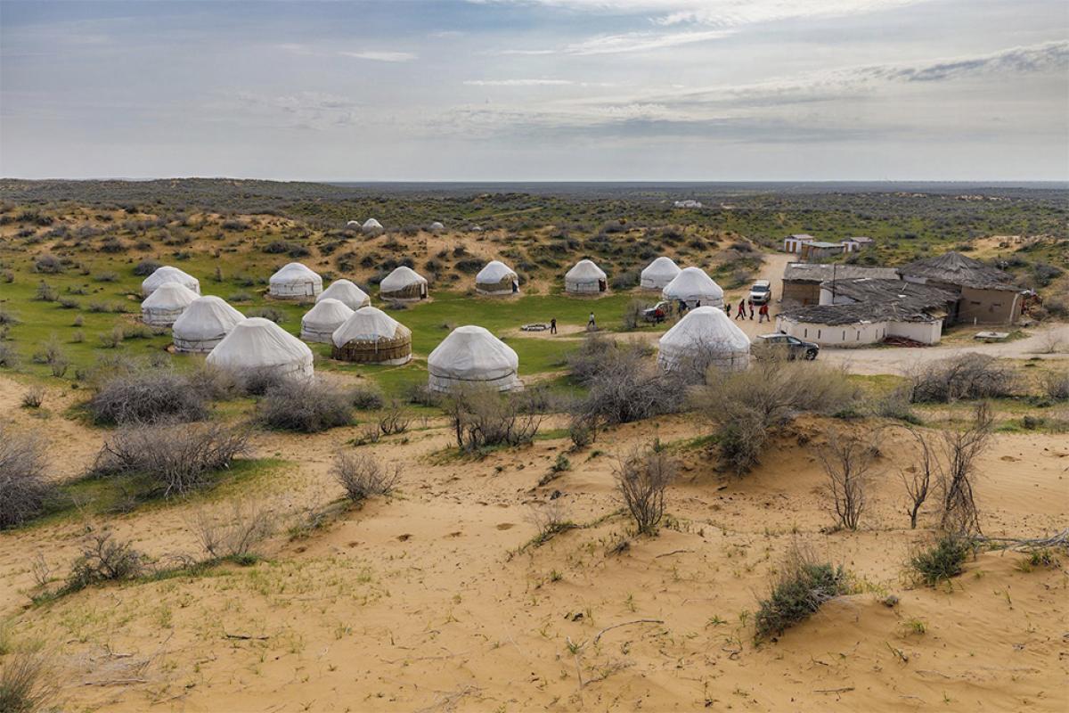 An exciting and educational excursion into the heart of Asia's great Kyzylkum Desert. You'll be able to work on a real potter's wheel in a ceramicist's workshop, admire the stone carvings of prehistoric artists in the Sarmyshsay Petroglyph Park, ride Bactrian camels in the desert, listen to the songs of a national akyn (singer) around a campfire, and swim in the vast Aydarkul Lake.