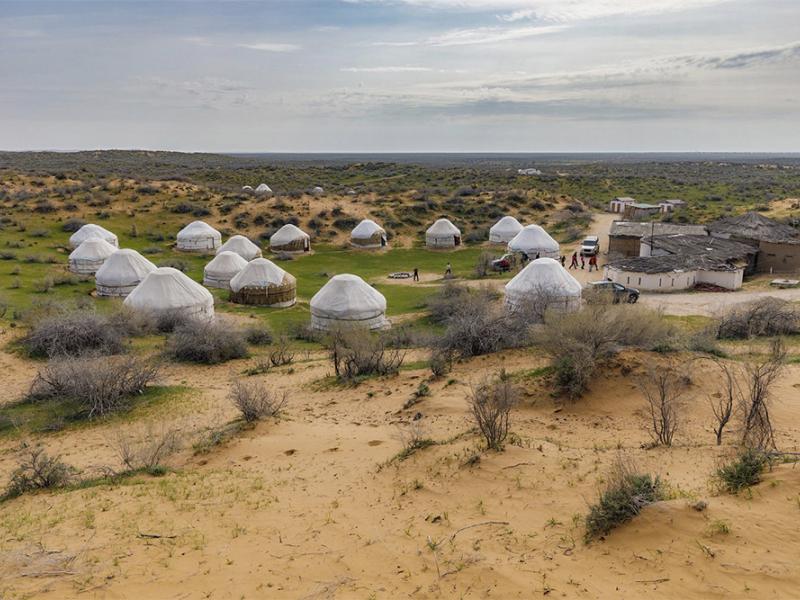 Early departure from Bukhara, drive to Sarmyshsay (150 km, 2 hours). En route, stop in Gijduvan to visit a ceramics workshop by renowned Uzbek masters. Explore petroglyphs. Transfer to Nurata (80 km, 1 hour). Visit the Chashma complex—a sacred spring—and the ruins of the Nur fortress, founded by Alexander the Great in the 4th century BC. Continue to the Yurt Camp (70 km, 1 hour), where you'll be accommodated in yurts. Watch the sunset from the dunes. In the evening, enjoy dinner by the fire and a performance by a Kazakh akyn (folk singer). Overnight in a yurt.